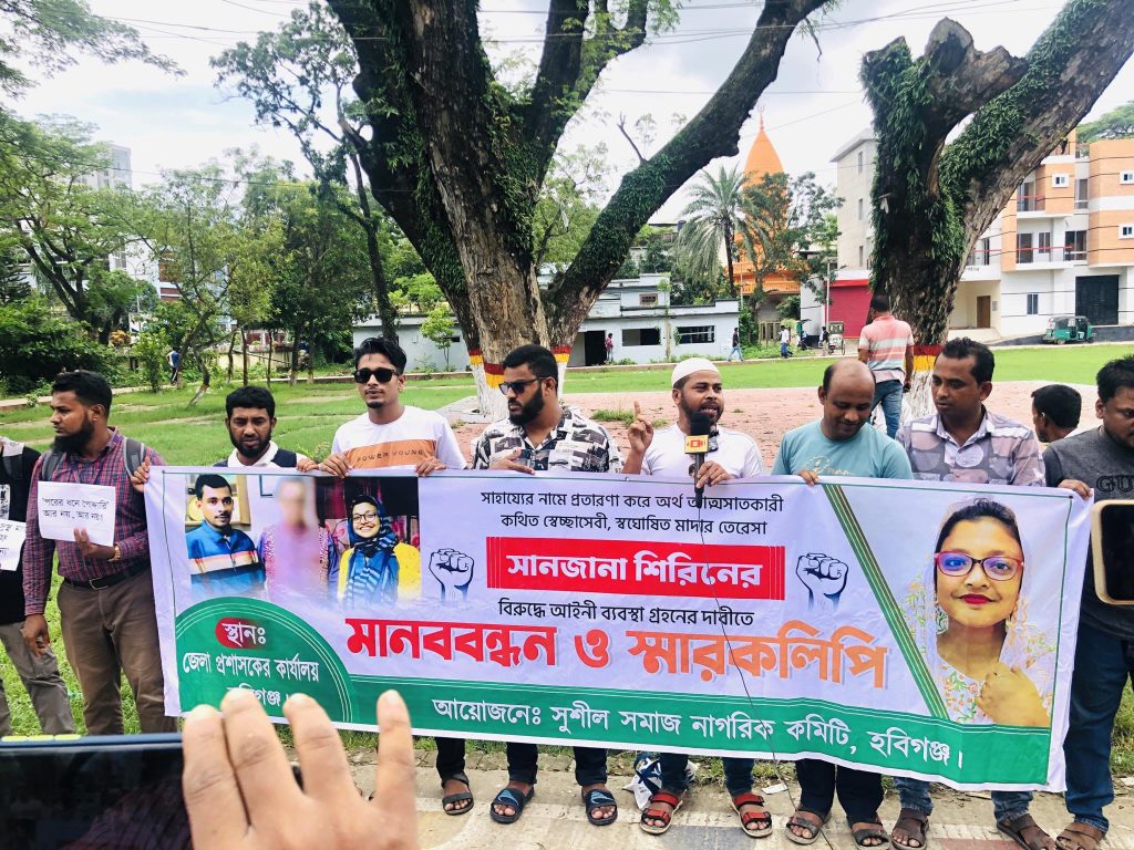 একইভাবে মিডওয়াইফারি (ধাত্রী প্রশিক্ষণ) ছাড়া গণহারে প্রসূতি ডেলিভারী করার বিষয়টি খতিয়ে দেখা হবে বলে জানান হবিগঞ্জের সিভিল সার্জন মোহাম্মদ নূরুল হক। স্মারকলিপি সুত্রে জানা যায়, বৃদ্ধাশ্রম নির্মাণ, নরমাল ডেলিভারী সেন্টার স্থাপন, অসহায়দের খাবারের সহযোগীতা করা ইত্যাদির নাম করে ফেসবুক পেইজের মাধ্যমে অর্থ সহায়তা সংগ্রহ করে নিজেই আত্মসাত করে আসছেন সানজানা শিরিন। নিজের কোন ধাত্রী প্রশিক্ষণ না থাকলেও গণহারে করে যাচ্ছেন নরমালা ডেলিভারী। এভাবেই নিঃস্ব অবস্থা থেকে মালিক হয়েছেন প্রাইভেট হাসপাতালের। ক্রয় করেছেন জমি-জমা। কেয়ার ভিসায় আপন বোনকে পাঠিয়েছেন ইংল্যান্ড। নামে বেনামে ক্রয় করেছেন সম্পত্তি। এ ছাড়াও ঢাকা জেলা গোয়েন্দা সংস্থার হাতে গ্রেফতার হয়ে জেল হাজতে থাকা বর্তমান সময়ের সমালোচিত মিল্টন সমাদ্দারের পক্ষে সাফাই গাইতে দেখা গেছে তাকে। এমনকি নিজেকে মিল্টন সমাদ্দারের অনুসারী পরিচয় দিয়ে সামাজিক যোগাযোগ মাধ্যমে ছড়িয়েছেন যুগলবন্দী ছবি। এদিকে, গতকাল আয়োজিত মানববন্ধনে বক্তারা বলেন, বৃদ্ধাশ্রম, নরমাল ডেলিভারী সেন্টার স্থাপনের নামে জুনিয়র মিল্টন সমাদ্দার খ্যাত সানজানা শিরিন মানুষের আবেগের সঙ্গে খেলা করেছে। সে অর্থ সহায়তা সংগ্রহ করে নিজেই এসব আত্মসাত করে নিজের আখের গোচ্ছাচ্ছে। আমরা তার দাবি জানাচ্ছি। পাশাপাশি সানজানা শিরিনকে দ্রæত গ্রেফতারের দাবি জানাই।