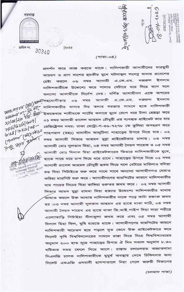 মামলার অভিযোগে বলা হয়, গত ৮ মার্চ ২০২৩ ইং আসামী সৈয়দ একেএম নজরুল ইসলাম ও তার সঙ্গীয়রা বাদীকে মেরে ফেলার উদ্দেশ্যে গলা চেপে ধরেন। আসামি রাসেল আহমদ চৌধুরী ও সিতার আহমদ চৌধুরী কিল-ঘুষি ও লাথি মেরে জখম করেন। এরপর আসামিরা বাদীকে মারধর ও নির্যাতন করেন এবং ঘরের আসবাবপত্র ভাঙচুর করেন। পরে নালিশকারীকে ১ নং আসামী রাসেল আহমদের গাড়ী দিয়ে আলুর তল এলাকায় নিয়ে যান আসামিরা জি আই পাইপ দিয়ে মারাত্মক ভাবে জখম করেন। পরে অজ্ঞান অবস্হায় একজন সিএনজি চালক নালিশকারীকে সিলেট এম এ জি ওসমানী হাসপাতালে নিয়ে গিয়ে ভর্তি করান।