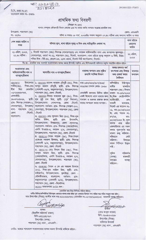 আসামিরা হলেন—রাসেল আহমদ চৌধুরী,সিতার আহমদ মুন্না,সুলতান মিয়া,সৈয়দ শায়েক,মোঃ দিলাল মিয়া,সৈয়দ একেএম নজরুল ইসলাম।