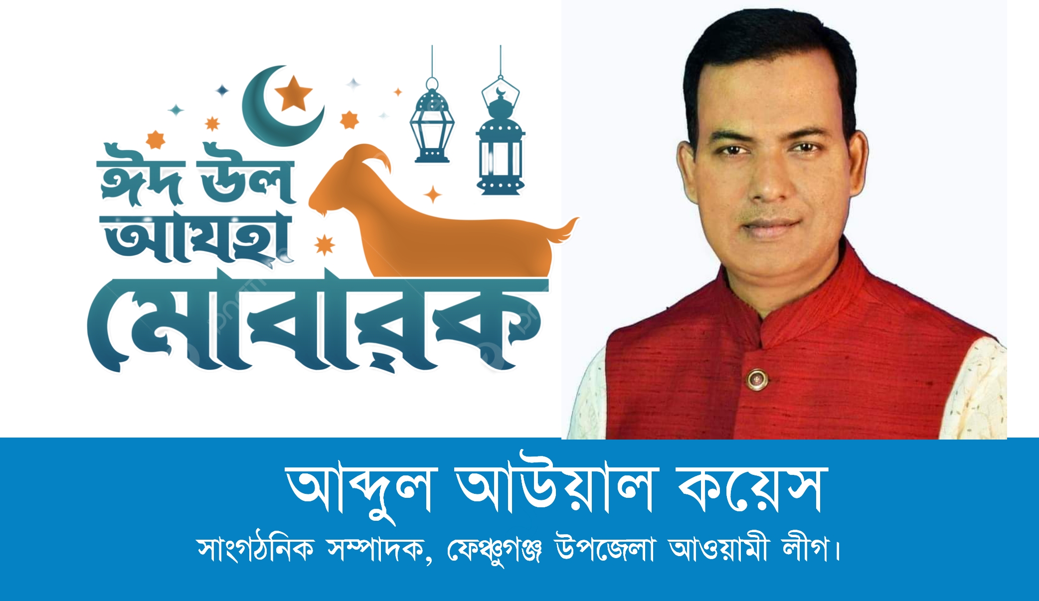 পবিত্র ঈদুল আজহা উপলক্ষে দেশ বিদেশের অবস্থানরত মুসলিম উম্মাহ সহ ফেঞ্চুগঞ্জ উপজেলাবাসীকে পবিত্র ঈদুল আযহার শুভেচ্ছা জানিয়েছেন ফেঞ্চুগঞ্জ উপজেলা আওয়ামী লীগের সাংগঠনিক সম্পাদক ও সাবেক জেলা পরিষদের সদস্য আব্দুল আউয়াল কয়েস।