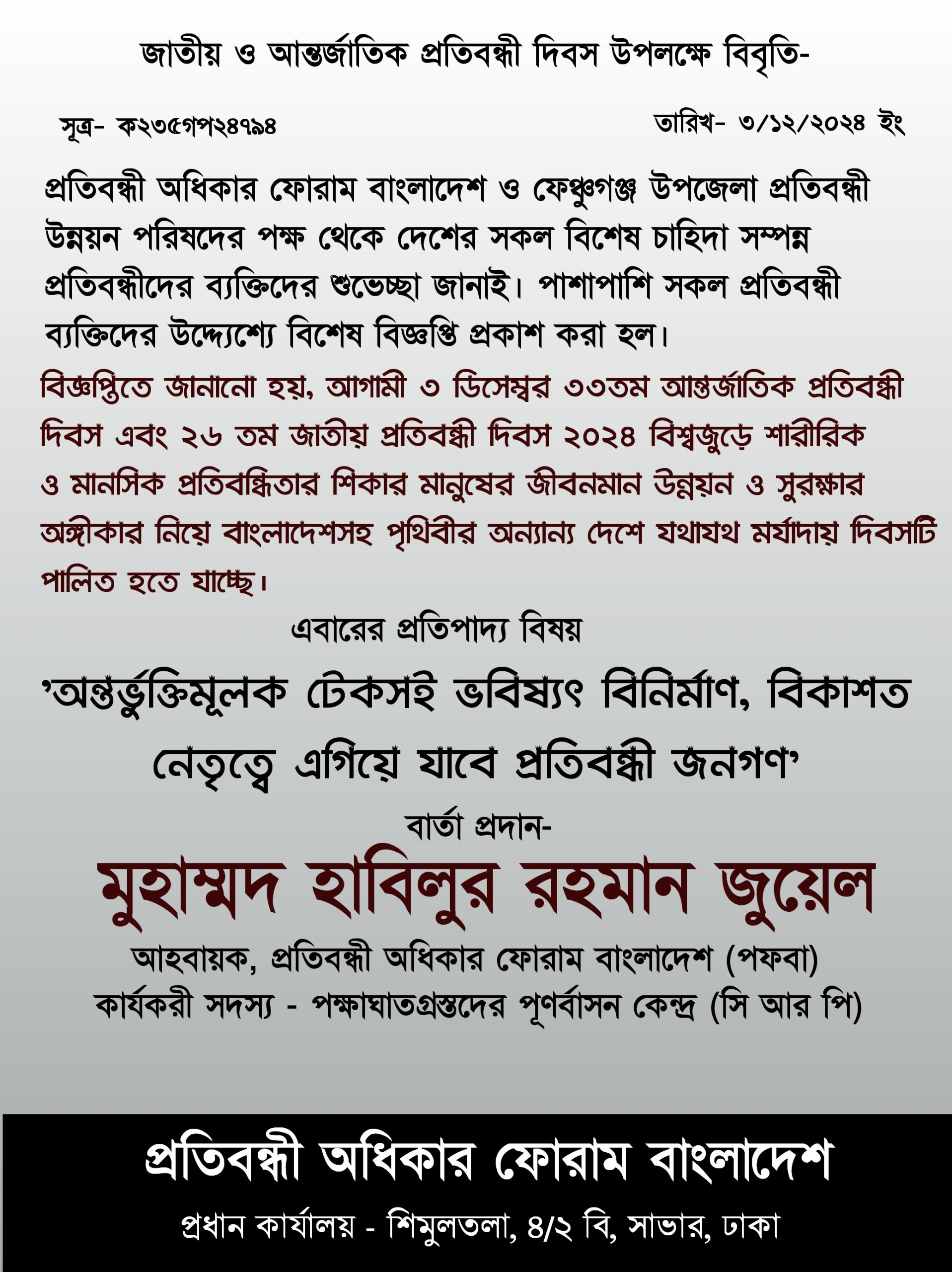 আগামী ৩ ডিসেম্বর ৩৩তম আন্তর্জাতিক প্রতিবন্ধী দিবস এবং ২৬ তম জাতীয় প্রতিবন্ধী দিবস ২০২৪ বিশ্বজুড়ে শারীরিক ও মানসিক প্রতিবন্ধিতার শিকার মানুষের জীবনমান উন্নয়ন ও সুরক্ষার অঙ্গীকার নিয়ে বাংলাদেশসহ পৃথিবীর অন্যান্য দেশে যথাযথ মর্যাদায় দিবসটি পালিত হতে যাচ্ছে।