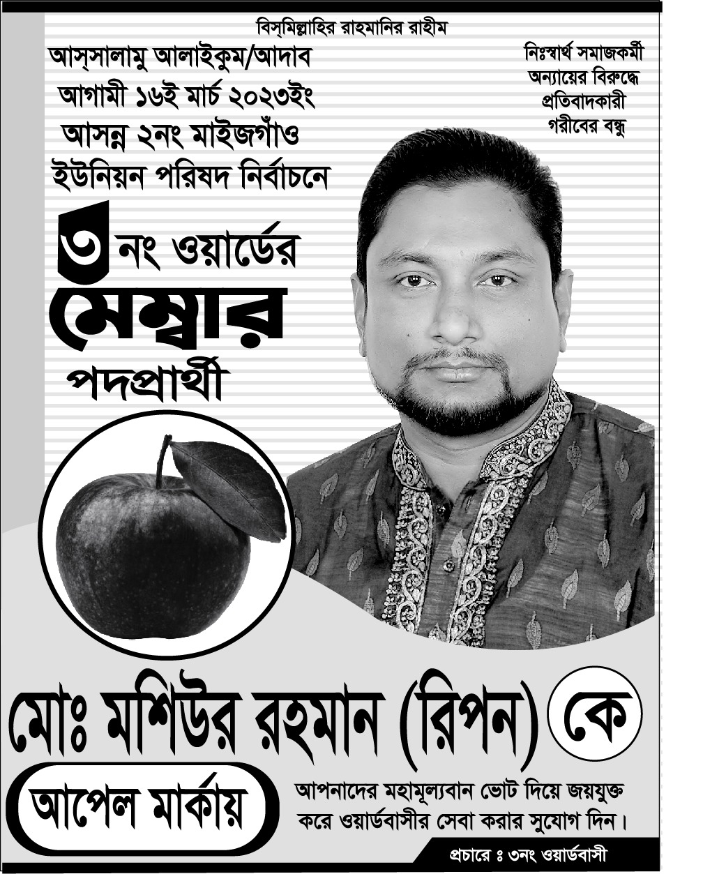 মুহাম্মদ জুয়েল, ফেঞ্চুগঞ্জ প্রতিনিধিঃ আগামী ১৬ ই মার্চ অনুষ্ঠিত হবে ফেঞ্চুগঞ্জ উপজেলার ৫ টি ইউনিয়নের ভোট গ্রহণ। এর মধ্যে সবচেয়ে গুরুত্বপূর্ণ ইউনিয়ন ২ নং মাইজগাঁও ইউনিয়ন এর ৩ নং ওয়ার্ডের ইউপি সদস্য পদপ্রার্থী মশিউর রহমান রিপন (আপেল প্রতীক) তার পোষ্টার ছেড়ার অভিযোগ করেছেন। জালালাবাদ ভিউকে তিনি জানান, আমি ২ মার্চ আমার ওয়ার্ডের উত্তর ফরিদপুর এবং মধ্য ফরিদপুর এলাকায় পোষ্টার ছিড়ে ফেলার কথা জানান৷ তিনি বলেন, নির্বাচন সাময়িক সময়ের জন্য। কিন্তু পোষ্টার ছিড়ে প্রচারণায় বাধা তা ঠিক নয়।