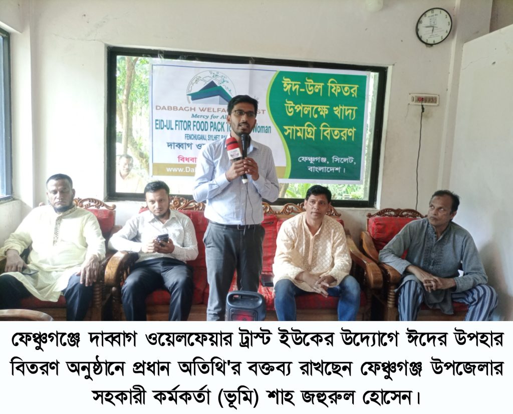 অনুষ্ঠানে দাব্বাগ ওয়েলফেয়ার ট্রাস্ট ইউকের বাংলাদেশ (ফেঞ্চুগঞ্জ) এর সমন্বয়কারী ও সিলেট পল্লী বিদ্যুৎ সমিতি ১ এর সচিব এবং ফেঞ্চুগঞ্জ উপজেলা মুক্তিযোদ্ধা সন্তান সংসদ কমান্ডের সভাপতি আব্দুল হাই নন্না’র সভাপতিত্বে ও সাংবাদিক মুহাম্মদ হাবিলুর রহমান জুয়েল এর সঞ্চালনায় প্রধান অতিথি হিসেবে বক্তব্য রাখেন ফেঞ্চুগঞ্জ উপজেলার সহকারী কর্মকর্তা (ভূমি) শাহ জহুরুল হোসেন। বিশেষ অতিথি হিসেবে বক্তব্য রাখেন – সিলেট পল্লী বিদ্যুৎ সমিতি ১ এর ডিজিএম মো. জিল্লুর রহমান, ফেঞ্চুগঞ্জ প্রেসক্লাবের সহ-সভাপতি এস এম মামুনুর রশীদ, স্থানীয় ইউপি সদস্য – জিয়াউল ইসলাম তুলা, সিলেট মোবাইল জার্নালিস্ট এসোসিয়েশন এর সাধারণ সম্পাদক জাহিদুর রহমান রিপন।