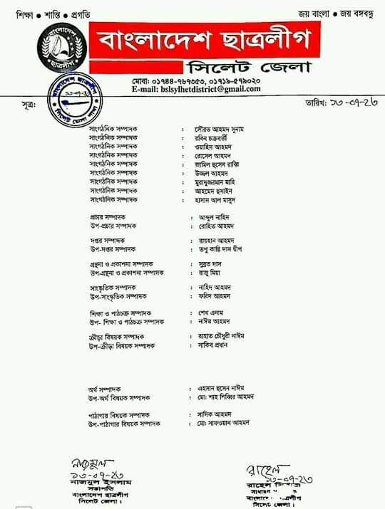 ফেঞ্চুগঞ্জ সরকারি কলেজ ছাত্রলীগের কমিটি ঘোষণা, সভাপতি – জাকারিয়া : সম্পাদক – মল্লিক, সাংগঠনিক: মাহি