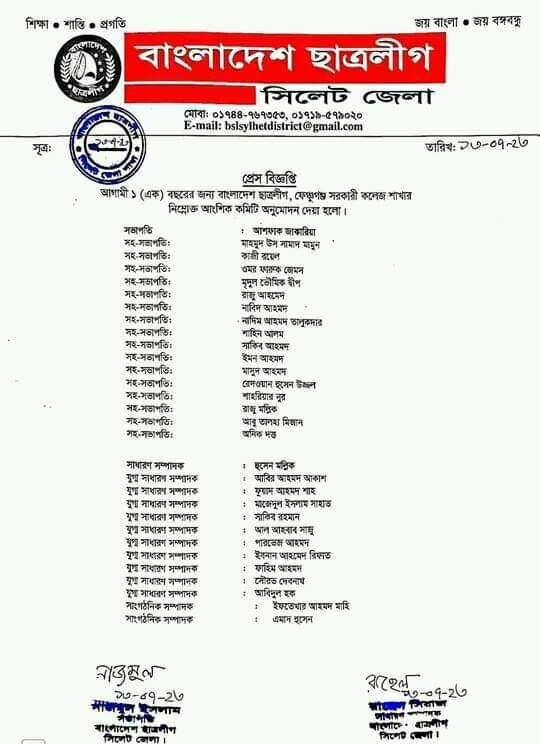 সিলেটের ফেঞ্চুগঞ্জ সরকারি কলেজ ছাত্রলীগের কমিটি আজ বৃহস্পতিবার দুপুরে সিলেট জেলা ছাত্রলীগের সভাপতি নাজমুল ইসলাম ও সাধারণ সম্পাদক রাহেল সিরাজ স্বাক্ষরিত এক প্রেস বিজ্ঞপ্তিতে ৭৭ সদস্য বিশিষ্ট কমিটি ঘোষণা করা হয়।