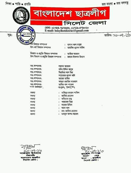 ফেঞ্চুগঞ্জ সরকারি কলেজ ছাত্রলীগের কমিটি ঘোষণা, সভাপতি – জাকারিয়া : সম্পাদক – মল্লিক, সাংগঠনিক: মাহি