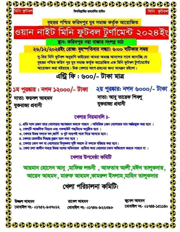 সিলেটের ফেঞ্চুগঞ্জ উপজেলার বৃহত্তর পশ্চিম ফরিদপুর যুব সংঘের উদ্যোগে ও যুক্তরাজ্য প্রবাসী সাবেক ছাত্রনেতা ফয়ছল আহমদ ও আবু তাহেফ শিবলু’র সহযোগিতায় ওয়ান নাইট মিনি ফুটবল টুর্নামেন্ট এর উদ্বোধন ২৬ ডিসেম্বর বৃহস্পতিবার সন্ধ্যায় অনুষ্ঠিত হয়।
