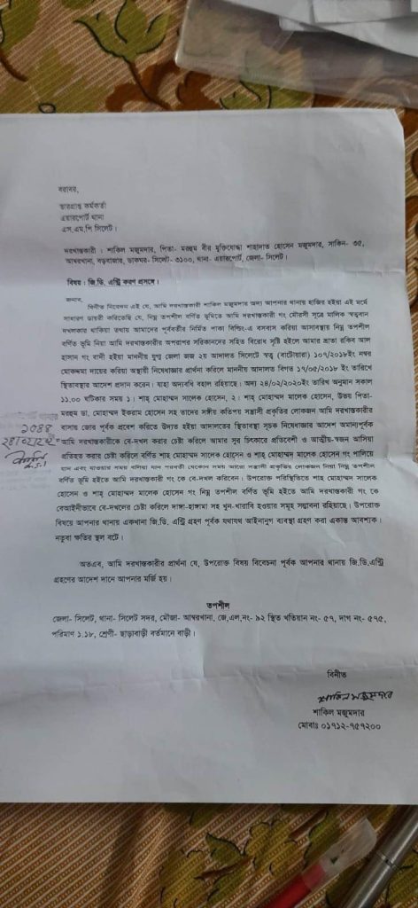 ফলে উভয়পক্ষ দখলদারি থেকে বিরত ছিলেন।আদালতের নিষেধাজ্ঞা অমান্য করে বিগত ১৮ সেপ্টেম্বর ২০২৩ ইং এসএমপি এয়ারপোর্ট থানা পুলিশের এক কর্মকর্তা ও সিলেট সিটি কর্পোরেশনের এক কর্মচারীর নেতৃত্বে অবৈধভাবে সীমানা প্রাচীর নির্মান কাজ শুরু করা হয়।সেই সাথে মানা হচ্ছে না বিল্ডিং কন্সট্রাকশনের কোন বাধ্যবাধকতা ঝুকিপূর্ণ হচ্ছে বাসাবাড়ি।এমতাবস্থায় জায়গা দখল ও সীমানা প্রাচীর তুলতে বাধা দেওয়ায় প্রয়াত বীরমুক্তিযোদ্ধার সন্তানকে দেওয়া হচ্ছে হত্যা,গুমসহ নানান ধরনের হুমকি।নিজেদের নিরাপত্তার কথা চিন্তা করে দেশ ছেড়ে পাড়ি জমিয়েছেন দূর প্রবাসে।সেই সুযোগই কাজে লাগিয়েছেন প্রতিবেশি শাহ সালেক হোসেন ও শাহ মালেক হোসেন।শাহ সালেক হোসেনের ভাড়াটিয়া সিলেট সিটি কর্পোরেশনের কর্মচারী এবং শাহ মালেক হোসেনের পরিচিত পুলিশের কিছু অসাধু কর্মকর্তার অপকর্ম থেকে রক্ষা পেতে পুলিশের উর্ধত্বন কর্মকর্তা সহ বিভিন্ন মহলের দ্বারস্থ হচ্ছেন ভুক্তভোগী প্রয়াত বীরমুক্তিযোদ্ধা শাহাদাত হোসেন মজুমদারের ছেলে শাকিল মজুমদার।