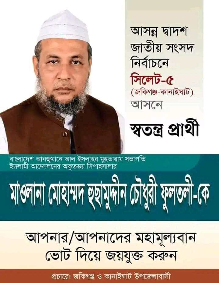 আসুন দলমত নির্বিশেষে দ্বীন ইসলামের স্বার্থে মাওলানা হুছামুদ্দীন চৌধুরী ফুলতলীর পাশে দাড়াই। ভোট দিয়ে, দোয়া করে, সার্বিক সহযোগিতার মাধ্যমে- জয়যুক্ত করে সংসদে একজন আল্লাহর ওলী’কে প্রেরণ করি।