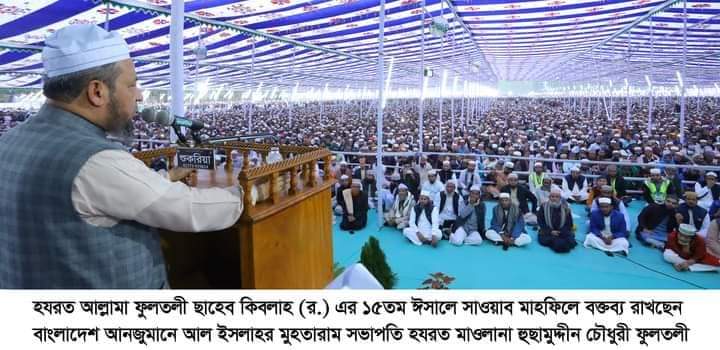 গত ১৫ জানুয়ারি (রবিবার) ফুলতলী ছাহেব বাড়ি সংলগ্ন বালাই হাওরে অনুষ্ঠিত হলো আল্লামা ফুলতলী ছাহেব কিবলাহ (র.)-এর ১৫তম ইন্তেকাল বার্ষিকী উপলক্ষে বিশাল ঈসালে সাওয়াব মাহফিল। এতে মুরিদীন-মুহিব্বীনের উদ্দেশ্যে তা’লীম-তরবিয়ত পেশ করেন আল্লামা ফুলতলী ছাহেব কিবলাহ (র.)-এর সুযোগ্য উত্তরসূরী উস্তাযুল উলামা ওয়াল মুহাদ্দিসীন, মুরশিদে বরহক হযরত আল্লামা ইমাদ উদ্দিন চৌধুরী বড় ছাহেব কিবলাহ ফুলতলী। তিনি বলেন, আল্লামা ফুলতলী ছাহেব কিবলাহ (র.) একদিকে কুরআন-হাদীস শিক্ষা দিয়েছেন, অন্যদিকে নির্জনে আল্লাহর যিকরে সময় কাটিয়েছেন। যারা সিলসিলার সাথে সম্পৃক্ত আপন মুরশিদের নির্দেশনায় মাঝে মধ্যে নির্জনবাসের চেষ্টা করবেন। হিযবুল বাহার, দালাইলুল খাইরাত পড়বেন। সর্বোপরি সর্বাবস্থায় শরীয়তের অনুসরণ করবেন। যিকরের ক্ষেত্রে তরীকার অনুসরণ করবেন। সিলসিলার নামে ভণ্ডামি করলে সিলসিলার ফয়েয থেকে বঞ্চিত ও ক্ষতিগ্রস্থ হবেন। ফুলতলী ছাহেব কিবলাহ (র.) ইলমে কিরাতের সনদ দিয়েছেন, হাদীস শরীফের সনদ দিয়েছেন। এগুলোর মাধ্যমে মদীনার সাথে তাআল্লুক সৃষ্টি হয়েছে। যথাসম্ভব এসব সনদের হক আদায় করবেন। তিনি উপস্থিত সকলকে নসীহত করে বলেন, মা-বাবার খিদমত করুন। তাদের দুআ নিন। তারা দুনিয়ায় না থাকলে তাদের জন্য দুআ করুন। হিংসা-বিদ্বেষ থেকে দূরে থেকে ভালোবাসার পরিবেশ তৈরি করুন। তিনি বলেন, বিপদ-আপদে রাসূলুল্লাহ সা. এর ওসীলা নিয়ে আমরা দুআ করতে পারি। আহলে কিতাব কাফির-মুশরিকদের সাথে যুদ্ধে অবতীর্ণ হলে আহলে কিতাবদের মধ্যে যারা দ্বীন সম্পর্কে জ্ঞানী তারা রাসূল সা. এর ওসীলা নিয়ে দুআ করার পরামর্শ দিতেন। তারা দুআ করতেন হে আল্লাহ, আপনি যে নবী প্রেরণের ওয়াদা করেছেন সে নবীর ওসীলা নিয়ে দুআ করছি, আপনি আমাদের বিজয় দান করুন। তখন বিলম্ব ছাড়াই বিজয় আসতো। হযরত সাফীনা রা. নবীজির সাহাবী। তিনি নবীজির একটি চিঠি নিয়ে হযরত মুআয বিন জাবাল রা. এর কাছে যাচ্ছিলেন। পথিমধ্যে বাঘ তাকে আক্রমন করতে উদ্যত হলো। তিনি বাঘের উদ্দেশ্যে বললেন, সাবধান! আমি সাফীনায়ে রাসূল। আল্লাহর রাসূল আমাকে সাফীনা লকব দিয়েছেন। আমার কাছে আল্লাহর রাসূল এর একটি চিঠি রয়েছে। এ কথা শুনে বাঘ তাকে সম্মান জানালো। আমাদের হাতেও একটি চিঠি আছে। আর তা হলো, হুব্বে রাসূল। আমরা যতই অধম হই না কেন অন্তরে রাসূলুল্লাহ সা. এর মহব্বতের আসন রয়েছে। তিনি বলেন, যারা নেতৃত্বের আসনে বসেন, জনমনে তাদের প্রতি শ্রদ্ধা থাকে। কিছু মানুষ বন্ধু সেজে আবার তাদের সুনাম নষ্ট করতে চায়। দেশের কর্তৃত্বে যারা আছেন আল্লাহ যেন তাদের ধোঁকাবাজ থেকে রক্ষা করেন। ডারউইনের হাস্যকর তথ্য সম্পর্কে ভালোভাবেই আমার অধ্যয়ন করা আছে। সম্পূর্ণ ভিত্তিহীন একটি থিওরি। এসব কুফরী মতবাদ সম্