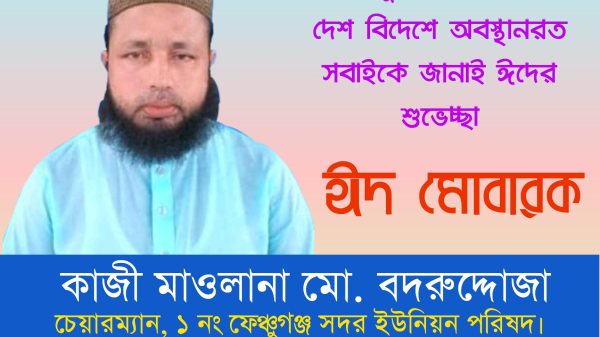 পবিত্র ঈদুল আযহা উপলক্ষে দেশ বিদেশে অবস্থানরত সবাইকে এবং ফেঞ্চুগঞ্জ সদর ইউনিয়নবাসী সহ ফেঞ্চুগঞ্জ উপজেলাবাসীকে শুভেচ্ছা জানিয়েছেন ফেঞ্চুগঞ্জ সদর ইউনিয়ন পরিষদের চেয়ারম্যান কাজী মাওলানা বদরুদ্দোজা। তিনি এক প্রেস বিজ্ঞপ্তিতে
