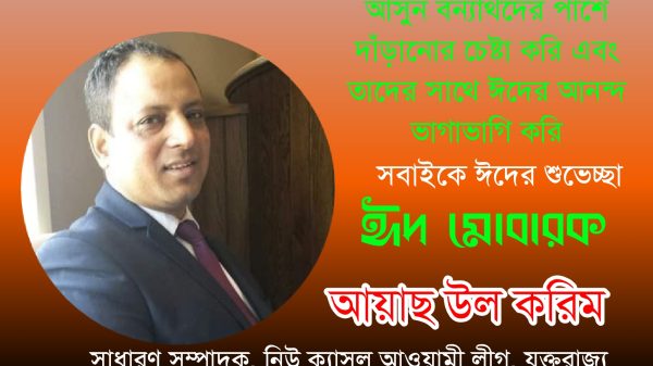 ভয়াবহ বন্যায় ক্ষতিগ্রস্ত মানুষের পাশে থেকে আসুন আমরা ঈদের শুভেচ্ছা বিনিময় করি। যুক্তরাষ্ট্র প্রবাসী নিউ ক্যাসল আওয়ামী লীগের সাধারণ সম্পাদক আয়াছ উল করিম করিম বন্যা কবলিত মানুষ সহ সবাইকে ঈদের