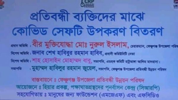 পক্ষাঘাতগ্রস্তদের পুনর্বাসন কেন্দ্র (সি আর পি) র আয়োজনে ও ফেঞ্চুগঞ্জ উপজেলা প্রতিবন্ধী উন্নয়ন পরিষদের বাস্তবায়নে এবং মানুষের জন্য ফাউন্ডেশন (এফসিডিও) এর সহযোগিতায় ফেঞ্চুগঞ্জ উপজেলার বিভিন্ন এলাকার প্রতিবন্ধী ব্যক্তিদের মাঝে কোভিড