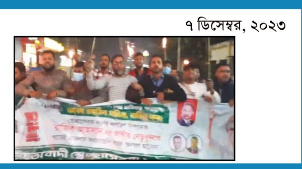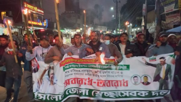 ৬ ও ৭ ডিসেম্বরের অবরোধ সফল করতে সিলেট জেলা স্বেচ্ছাসেবক দলের মশাল মিছিল