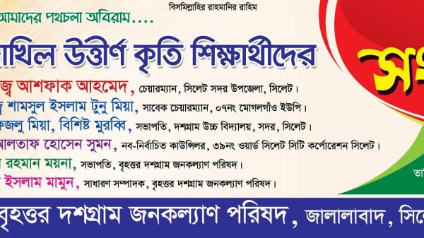 সিলেট সদর উপজেলার সামাজিক সংগঠন বৃহত্তর দশগ্রাম জনকল্যাণ পরিষদের উদ্যোগে ২০২৩ সালের এসএসসি, দাখিল উত্তীর্ণ কৃতি শিক্ষার্থীদের সংবর্ধনা অনুষ্ঠান আগামী ০৯ সেপ্টেম্বর ২৩, শনিবার বাদ যোহর স্থানীয় দশগ্রাম বাজারে অনুষ্ঠিত