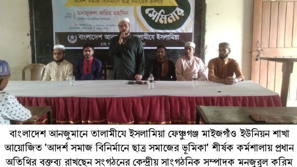 বাংলাদেশ আনজুমানে তালামীযে ইসলামিয়া ফেঞ্চুগঞ্জ উপজেলাধীন ২নং মাইজগাঁও ইউনিয়ন শাখার উদ্যোগে ‘আদর্শ সমাজ বিনির্মাণে ছাত্রসমাজের করণীয়’ শীর্ষক সেমিনার ও শাখা সভাপতি হারুন আহমদ হিরো’র প্রবাস গমন উপলক্ষে বিদায় সংবর্ধনা অনুষ্ঠান