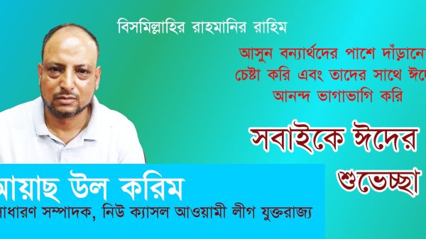 ভয়াবহ বন্যায় ক্ষতিগ্রস্ত মানুষের পাশে থেকে আসুন আমরা ঈদের শুভেচ্ছা বিনিময় করি। যুক্তরাষ্ট্র প্রবাসী নিউ ক্যাসল আওয়ামী লীগের সাধারণ সম্পাদক আয়াছ উল করিম বন্যা কবলিত মানুষ সহ সবাইকে ঈদের
