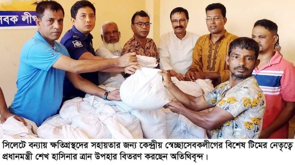 সিলেটে বন্যায় ক্ষতিগ্রস্থদের সহায়তার জন্য কেন্দ্রীয় সেচ্ছাসেবকলীগের বিশেষ টিমের নেতৃত্বে প্রধানমন্ত্রী শেখ হাসিনার ত্রান উপহার বিতরণ করা হয়েছে। বৃহস্পতিবার গোলাপগঞ্জের ঢাকাদক্ষিণ নগর সরকারী প্রাথমিক বিদ্যালয়ে প্রায় ২শ’ পরিবারের মধ্যে ত্রান