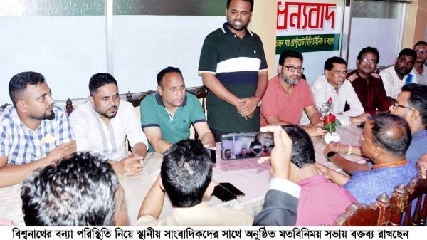 পাহাড়ি ঢল ও টানাবর্ষণে মাসখানেকের ব্যবধানে ফের বন্যায় কবলিত সিলেটের বিশ্বনাথ উপজেলার বন্যা পরিস্থিতি নিয়ে স্থানীয় সাংবাদিকদের সাথে মতবিনিময় করেছেন স্থানীয় সাবেক সংসদ সদস্য নিখোঁজ বিএনপি নেতা এম. ইলিয়াস আলীর