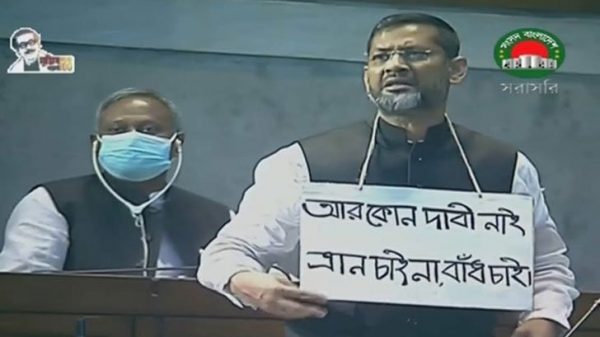 জাতীয় সংসদে গলায় প্ল্যাকার্ড ঝুলিয়ে নিজ এলাকার মানুষের দাবির কথা তুলে ধরেছেন ক্ষমতাসীন আওয়ামী লীগের এক সংসদ সদস্য (এমপি)। পটুয়াখালী-৩ আসনের সংসদ সদস্য এসএম শাহজাদা বুধবার সংসদে ২০২১-২২ অর্থবছরের প্রস্তাবিত