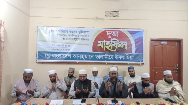 বাংলাদেশ আনজুমানে তালামীযে ইসলামিয়ার উদ্যোগে তুরস্ক ও সিরিয়ায় ভূমিকম্পে নিহতদের মাগফিরাত কামনা ও আহতদের সুস্থতা কামনায় দুআ মাহফিল অনুষ্ঠিত হয়েছে। ১৩ ফেব্রুয়ারি ২০২৩, সোমবার, বাদ মাগরিব এ দুআ মাহফিলে দুআ