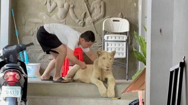সামাজিক যোগাযোগমাধ্যমে আদর ও গোসল করানোর ভিডিও প্রকাশ করার পর একটি পোষা সিংহ আটক করেছে কম্বোডিয়ার কর্তৃপক্ষ। কর্মকর্তারা জানিয়েছেন, এক চীনা নাগরিক এই প্রাণীটি আমদানি করে একটি ভিলায় রেখে লালন-পালন
