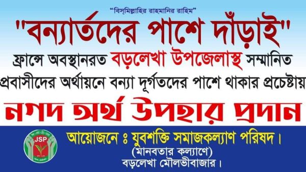 “বন্যার্তদের পাশে দাঁড়াই” এ শ্লোগান সামনে রেখে ফ্রান্সে অবস্থানরত বড়লেখা উপজেলার প্রবাসীদের অর্থায়নে ও মৌলভীবাজারের বড়লেখা উপজেলার স্বেচ্ছাসেবী সংঘটন যুবশক্তি সমাজকল্যাণ পরিষদ বড়লেখা এর ব্যবস্থাপনায় বন্যা দূর্গতদের পাঁশে থাকার প্রচেষ্টায়