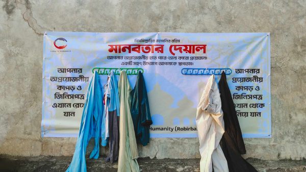 রবিরবাজার জামে মসজিদের দেয়ালে দৃশ্যমান ‘মানবতার দেয়াল’ নামে একটি ব্যানার সহ কয়েকটি হ্যাংগার। ‘আপনার অপ্রয়োজনীয় জিনিস রেখে যান, প্রয়োজনীয় জিনিস এখান থেকে নিয়া যান’। দেয়ালটির হ্যাংগারে কিছু কাপড় ঝুলানো। প্যান্ট-শার্ট-গেঞ্জি-চাদর