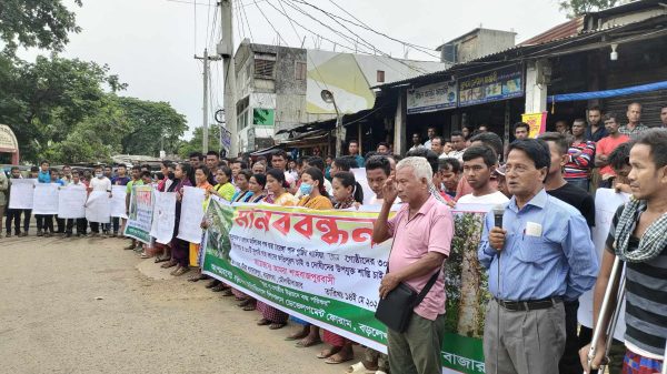 মৌলভীবাজারের বড়লেখা উপজেলায় আল্লাদাত চা বাগান কর্তৃক বেরেঙ্গা খাসিয়াপুঞ্জির চারটি পানজুমের ৩ হাজার পান গাছ ও ৬০টি সুপারি গাছ কেটে ফেলার প্রতিবাদে এবং এ ঘটনায় জড়িতদের দৃষ্টান্তমূলক শাস্তির দাবিতে মানববন্ধন